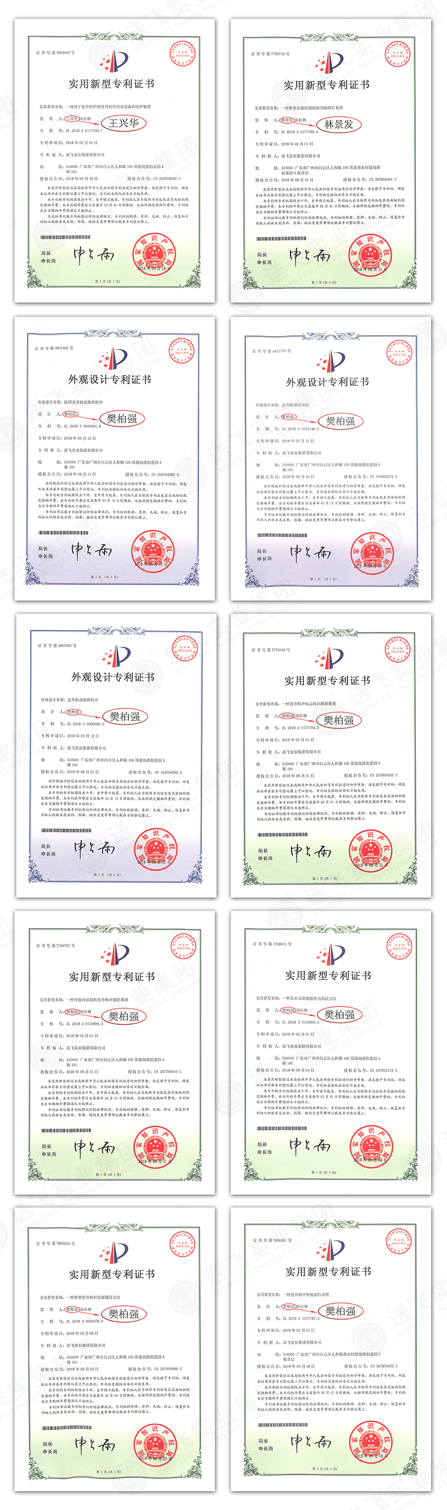 近日,送飛實(shí)業(yè)集團(tuán)再次迎來一個(gè)大喜訊!繼9月送飛收到國(guó)家知識(shí)產(chǎn)權(quán)局下發(fā)的一批專利證書后,本月又將11件專利證書收入囊中。至此,送飛此次收獲專利證書22個(gè),祝賀送飛!
