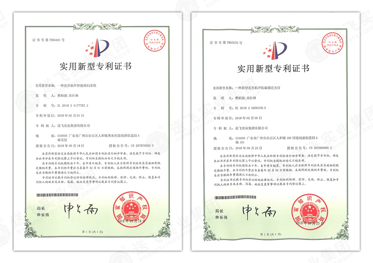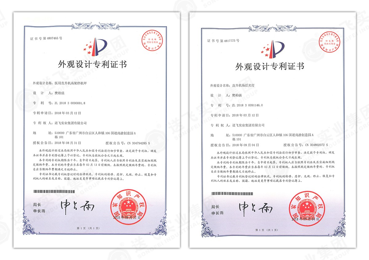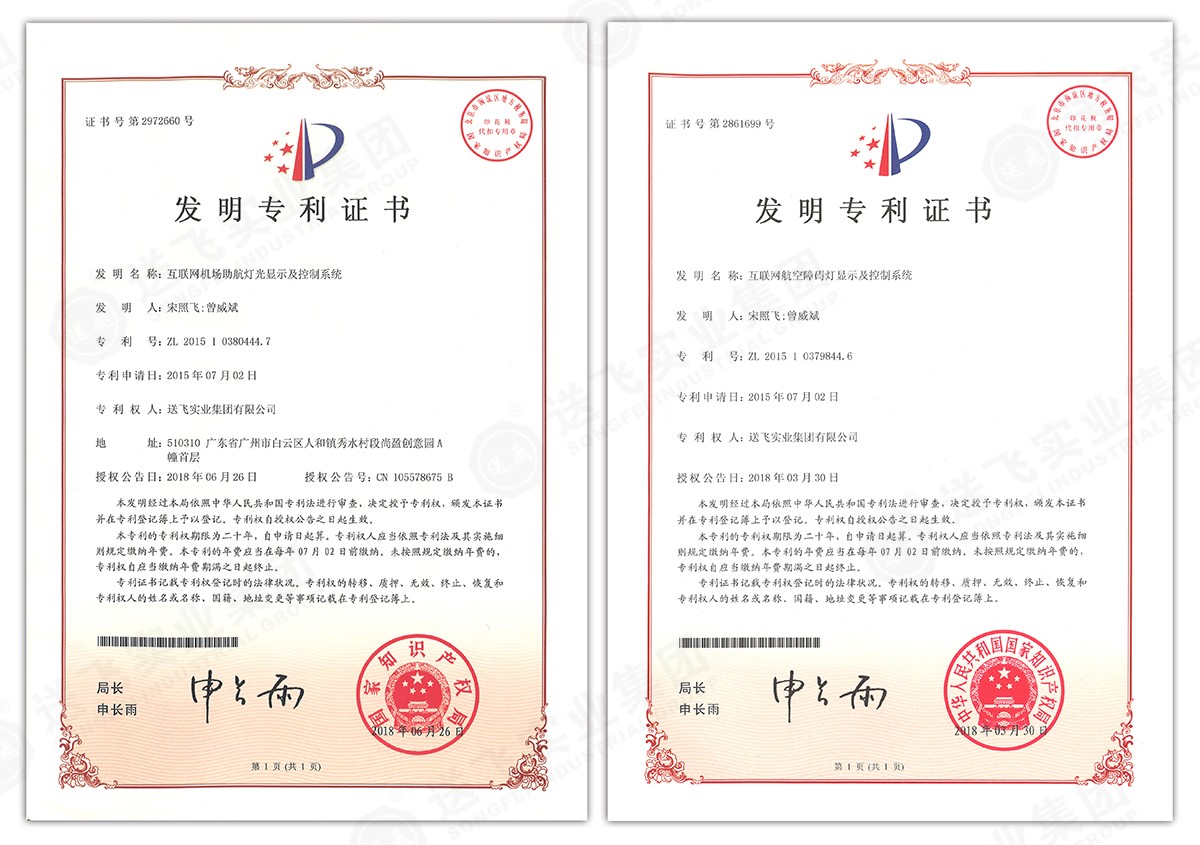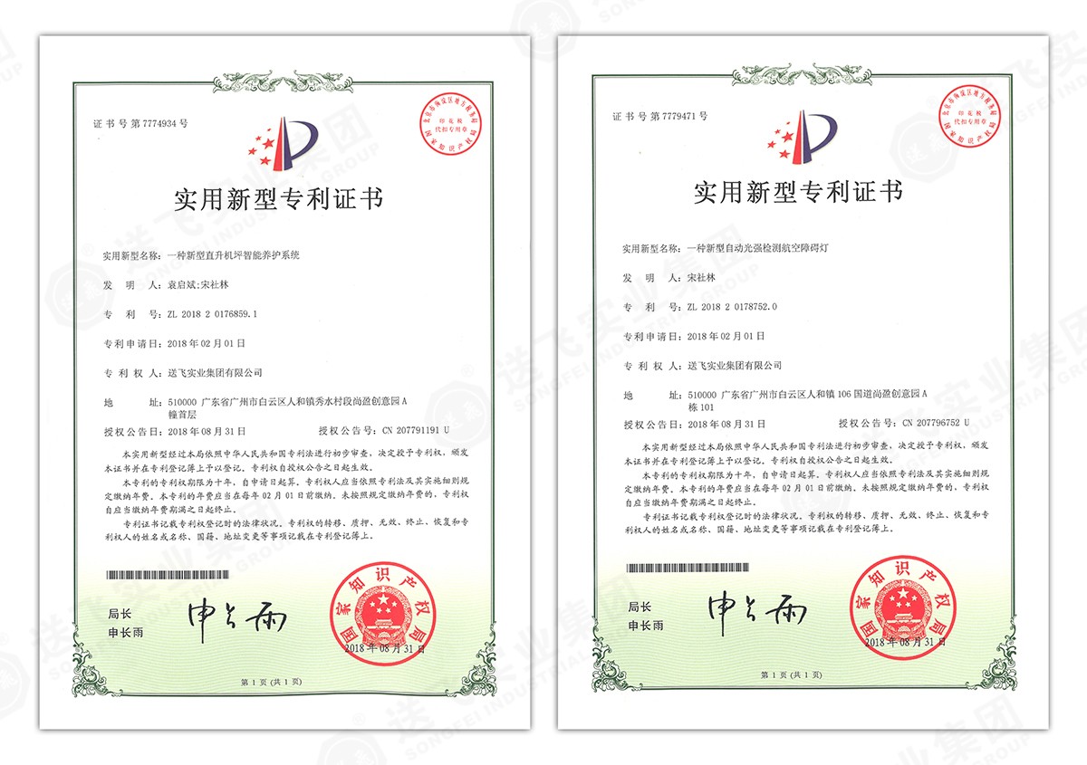 此次新下證專利有22個(gè),其中發(fā)明專利2個(gè),實(shí)用新型專利17個(gè),外觀設(shè)計(jì)專利3個(gè)。專利技術(shù)涵蓋航空障礙燈、直升機(jī)坪等多項(xiàng)產(chǎn)品和業(yè)務(wù)。目前,送飛成功申請(qǐng)專利逾百項(xiàng),填補(bǔ)了行業(yè)多項(xiàng)技術(shù)空白。